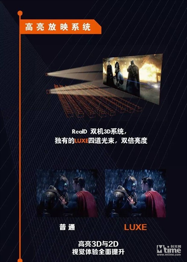 LUXE是全球影院放映技术公司RealD最新推出的一个优质巨幕品牌,所配备的各项设备均按照行业最高标准打造。所有LUXE厅都将配备2台RealD双机3D放映系统与一块RealD精准白幕。其中精准白幕技术能使画面的亮度更加均匀,使得观众坐在任何位置都能几乎相同的画面亮度,而其更好的银幕反射率,又能带来40%的额外光亮;2台高亮的RealD双机3D系统同时放射四道光束,其光效是其他双机3D系统的两倍,旨在带给观众高清高亮的3D与2D视觉体验。