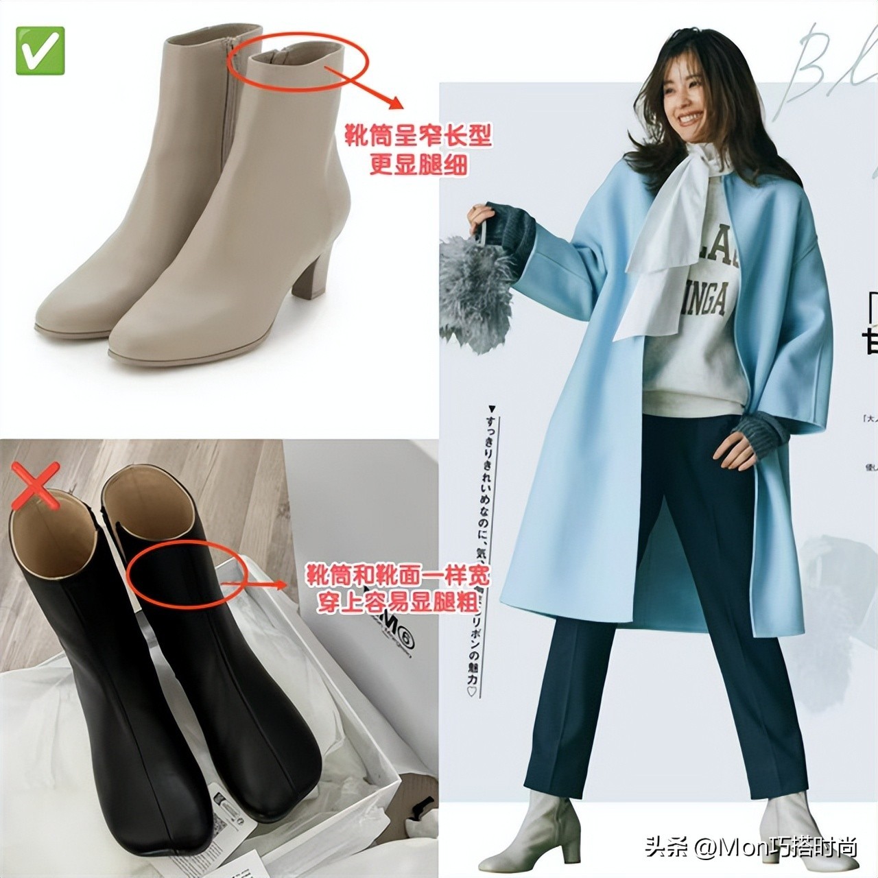小腿粗、没脚脖子的姐妹选平头裸靴时要注意避开和鞋面一样宽的宽松靴筒,不然超显腿粗!窄长型靴筒+适当的跟高+小平头是最不易出错的选择。