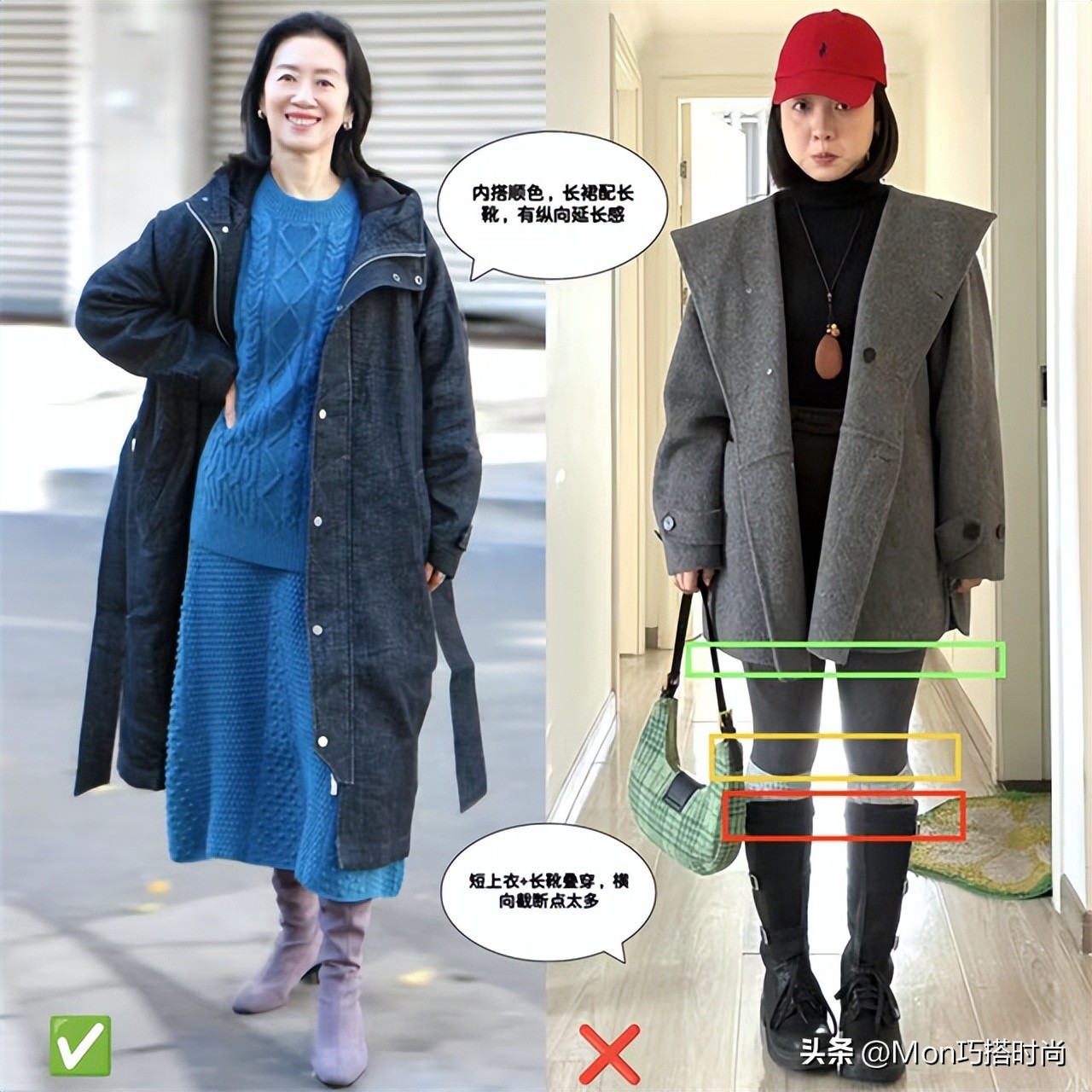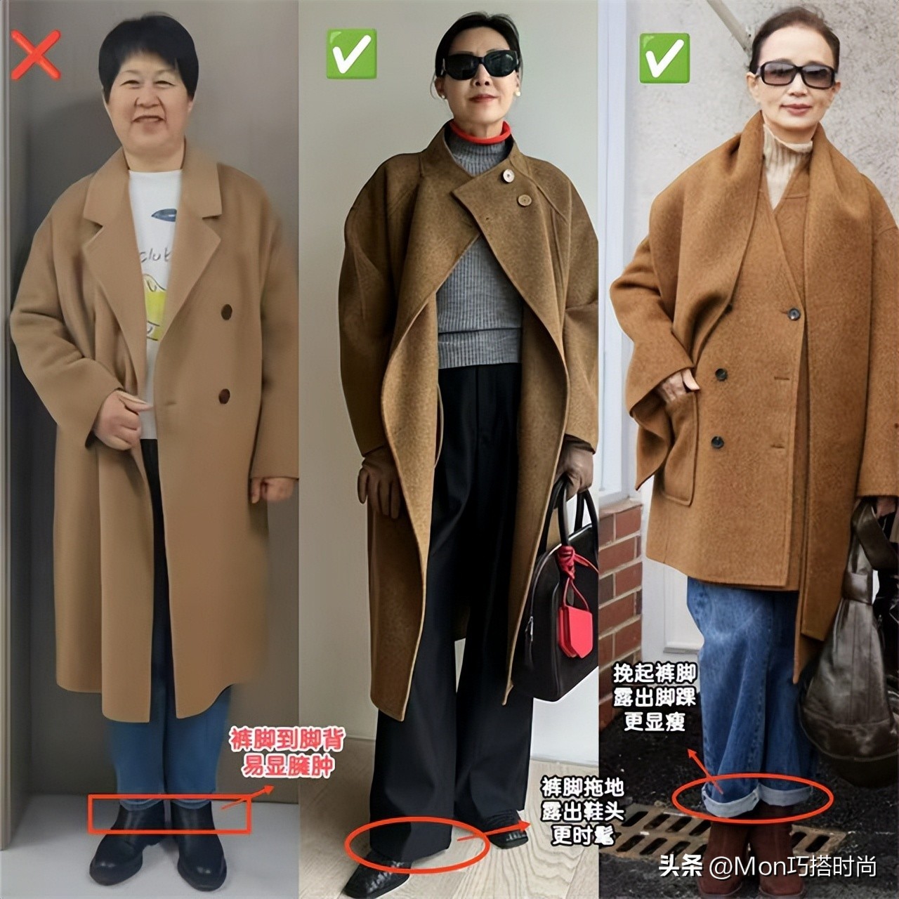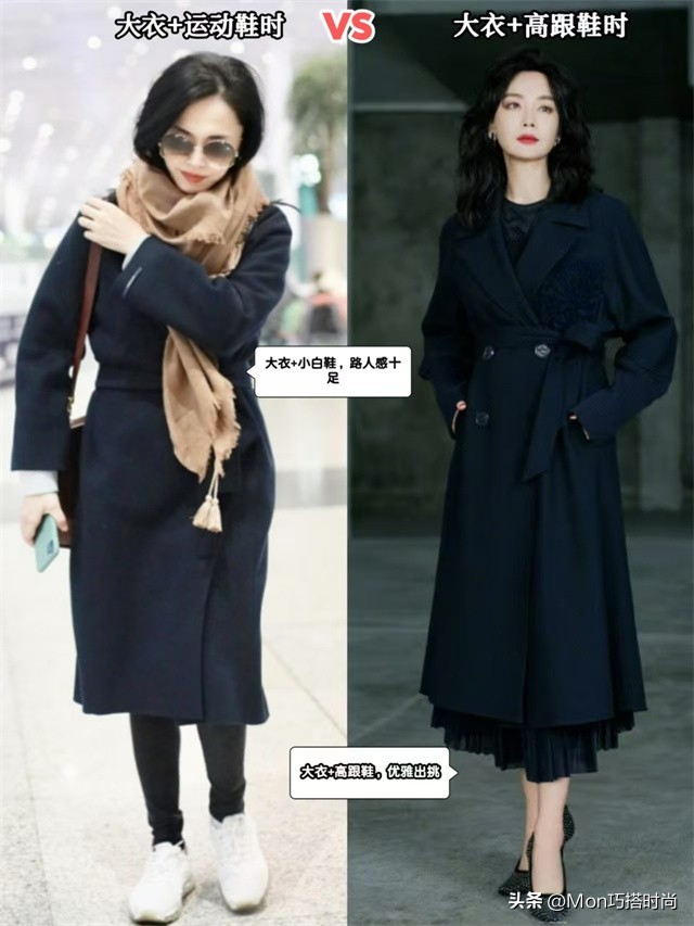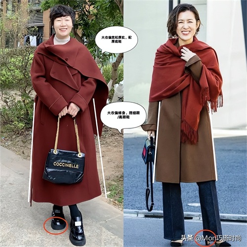 (规律一)宽松大衣+厚底鞋,修身大衣+高跟鞋