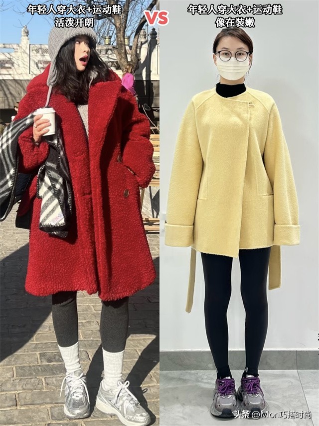 休闲低调的运动鞋很难压住大衣的气场,身材、长相普通的人穿上就是一场灾难!尤其是当大衣+运动鞋和其他穿法同框时,差距就更明显了~