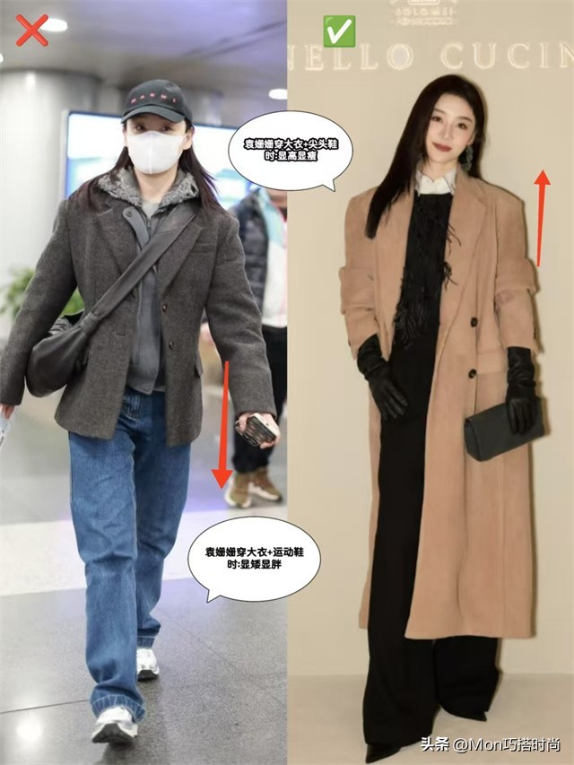 不建议中年女人穿大衣配运动鞋,还因为这样穿实在太显胖!连大明星袁姗姗都曾踩过雷:西装大衣+牛仔阔腿裤、老爹鞋,整体臃肿邋遢,显胖又显矮。
