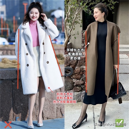 当然用大衣搭高跟鞋时也有不少细节要注意。尖头细高跟不宜配摇粒绒、羊羔绒等蓬松面料、宽松大量感版型的大衣,容易显得头重脚轻。
