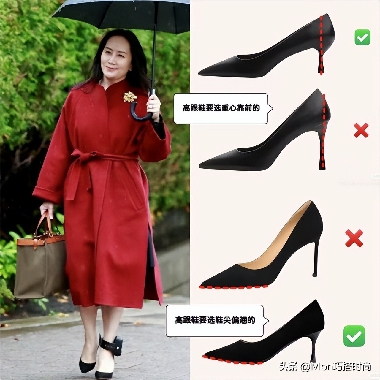 要让大衣变成中年女人的“优雅战袍”,第一选择当然是配“高跟鞋”。就连顶级名媛孟晚舟都爱这么穿,露出脚背、脚踝,女人味十足还显瘦显高。