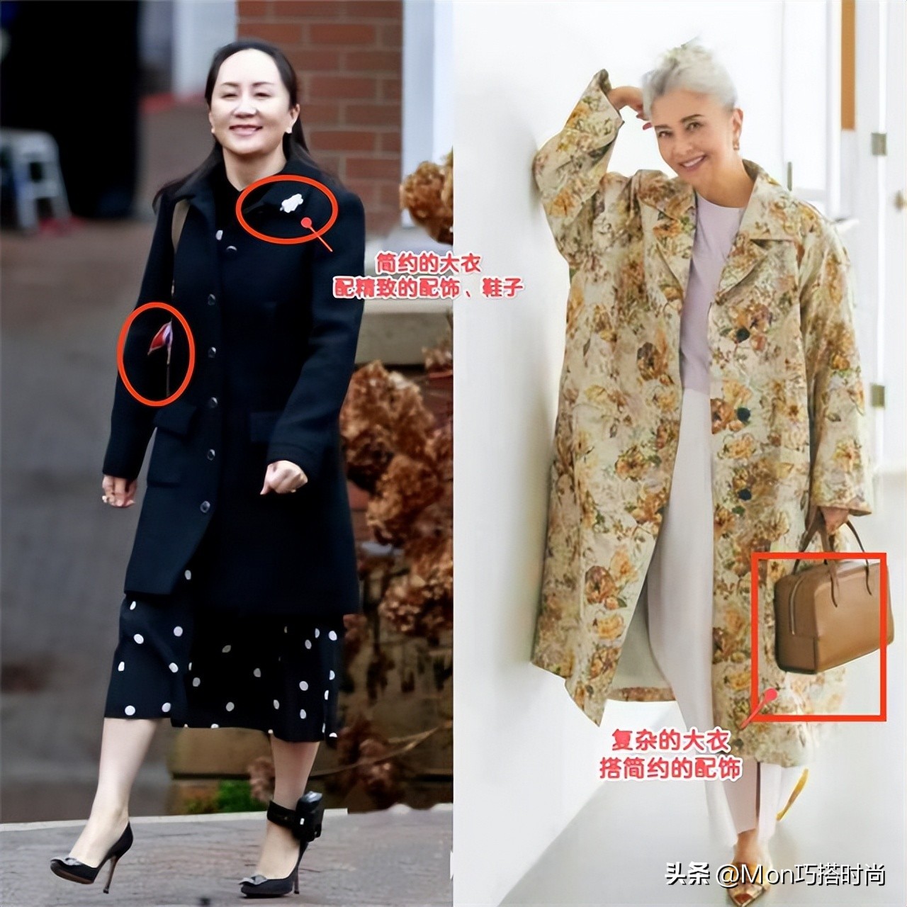 时尚感离不开配饰早就不是什么秘密了,大衣设计得越简约,越适合搭精致的配饰和鞋子。学孟晚舟系丝巾、戴胸针,配钻石装饰的高跟鞋,到老都优雅~