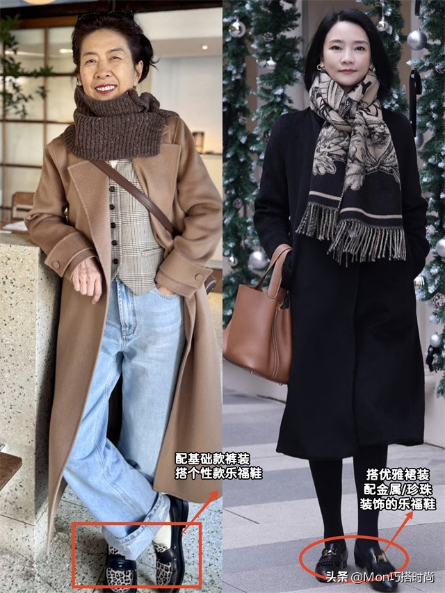 如穿基础低调的牛仔裤时,搭个性的豹纹拼接乐福鞋就很亮眼。换成优雅的长裙、丝袜,配带金属、珍珠装饰的乐福鞋才精致。穿大衣时若想变得更正式低调,就可换成哑光基础款乐福鞋……