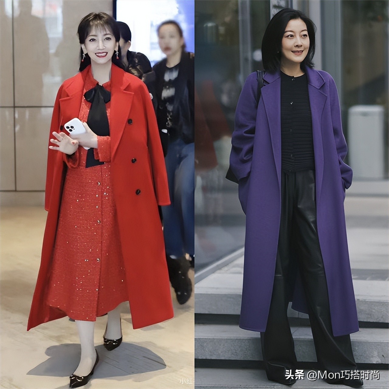 当然,“大衣颜色”也是不容忽视的一点。30岁以上的大龄女性穿正红、草绿等亮色系大衣有提亮肤色、减龄的效果。