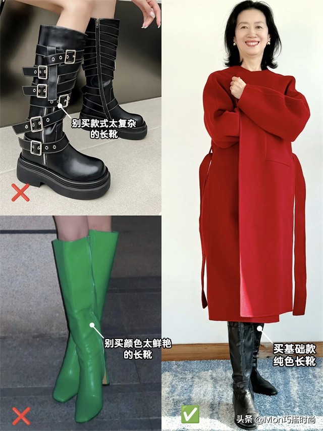 骑士靴、绑带靴等设计过于复杂的靴子,以及荧光绿、玫红色等太艳丽的长靴尽量别选,太难搭,就买最基础的纯色长靴即可~