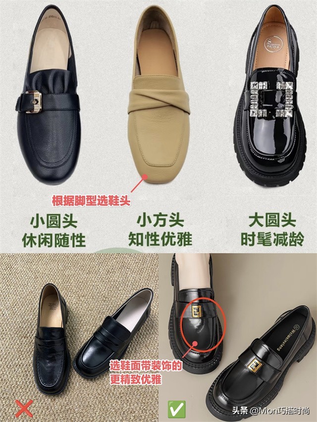“乐福鞋”才是舒适又好看的存在。可根据脚型选圆头、方头款,矮个子就选3-7cm的中粗跟或厚底款。嫌不够精致的,还可在鞋面加入金属、珍珠等装饰。