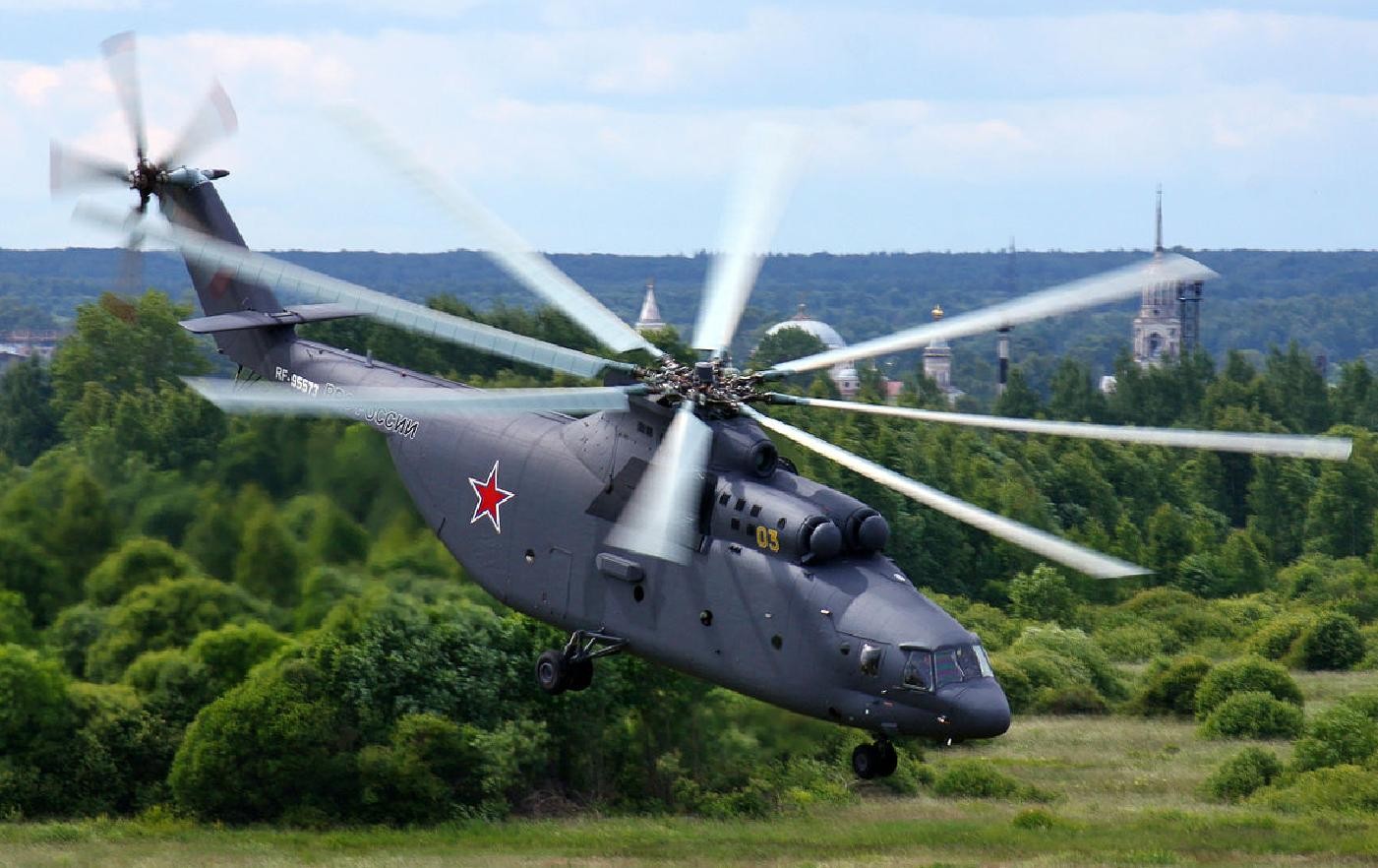 俄罗斯米-26 “光晕”:是由前苏联米里设计局研制的双发多用途直升机,于1980年服役,乘员5人,可载员90人,总产量300多架,目前仍在生产,载重量20吨,最大起飞重量56吨,其运力与美国C-130运输机相当,是世界现役最大、最重的运输直升机。