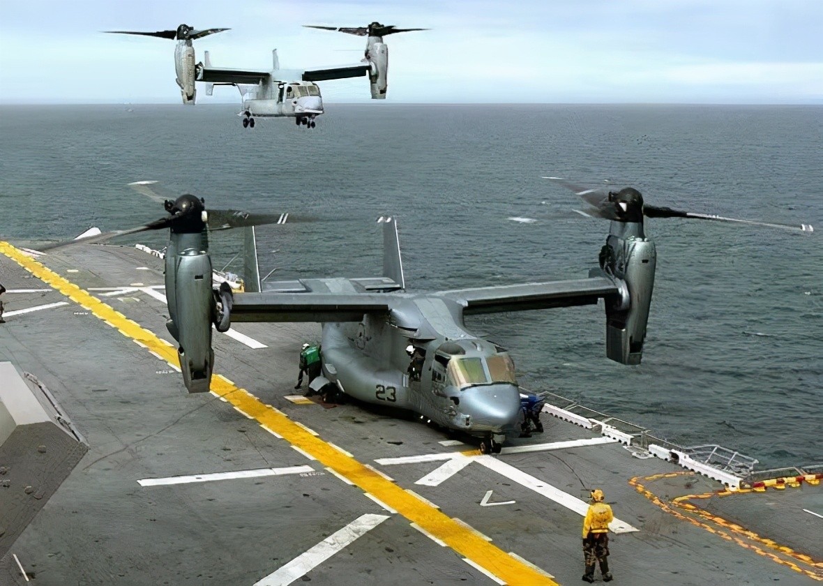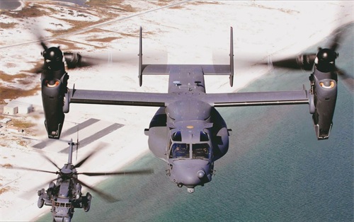 美国V-22“鱼鹰”:是由美国波音和贝尔直升机公司联合研制的倾转旋翼机,1982年开始研制,2006年服役,最大起飞重量27.4吨,可载员24人,既具备垂直起降和短距起降能力,又具有固定翼飞机的飞行速度,但因技术难度大,导致可靠性和安全性较差。