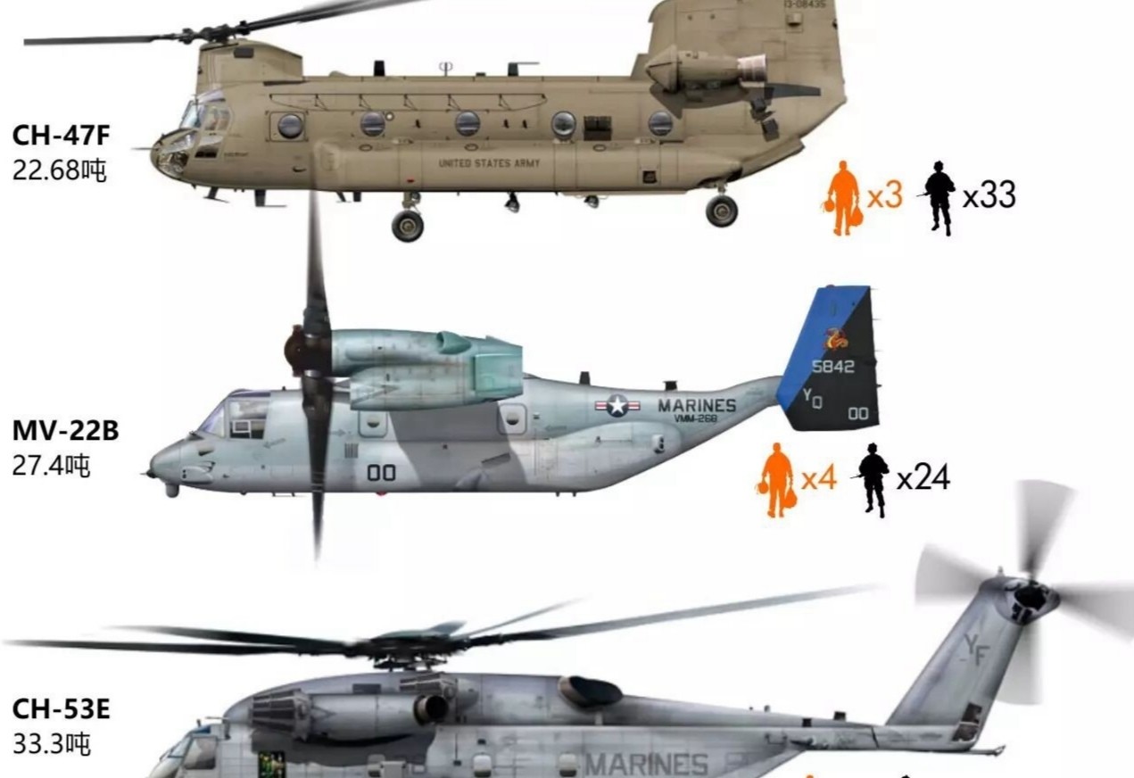 CH-53“海上种马”:是美国西科斯基公司研制的军民两用运输直升机,于1966年服役,载重量16吨,最大起飞重量38.4吨,可载员37人,共发展了CH-53E“超级种马”、CH-53K“种马王”三款型号,它是目前美军现役最大的运输直升机。