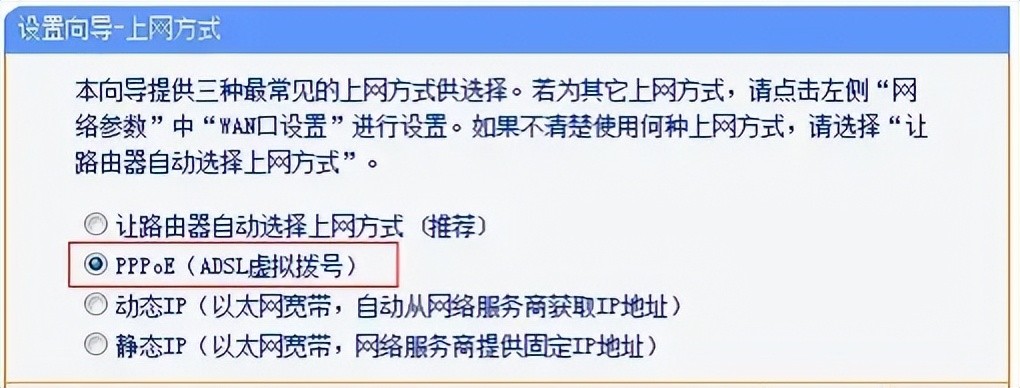 4.到这一步的时候,先需要选择上网方式,一般我们是选择PPPoE方式(也可以选择让路由器自动选择),选择后,点击下一步,如下图所示。