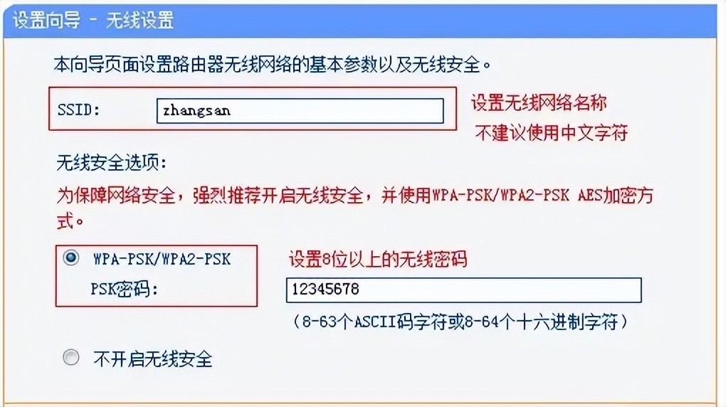 6.接下来就是无线网络设置了,也就是创建无线网络,主要填写无线网名称和无线网密码(密码建议尽量复杂一些,防止被蹭网),完成后,点击下一步继续。