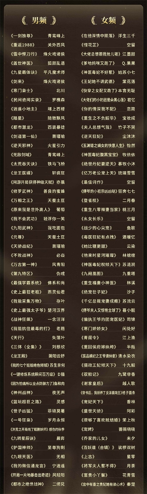 再来看看女频前十名。女频的来源平台就比较多样了。而且,古言与现言各占半壁江山,也是当前女频作品中的主流题材。可惜的是,没有看到网文老大起点平台的作品。