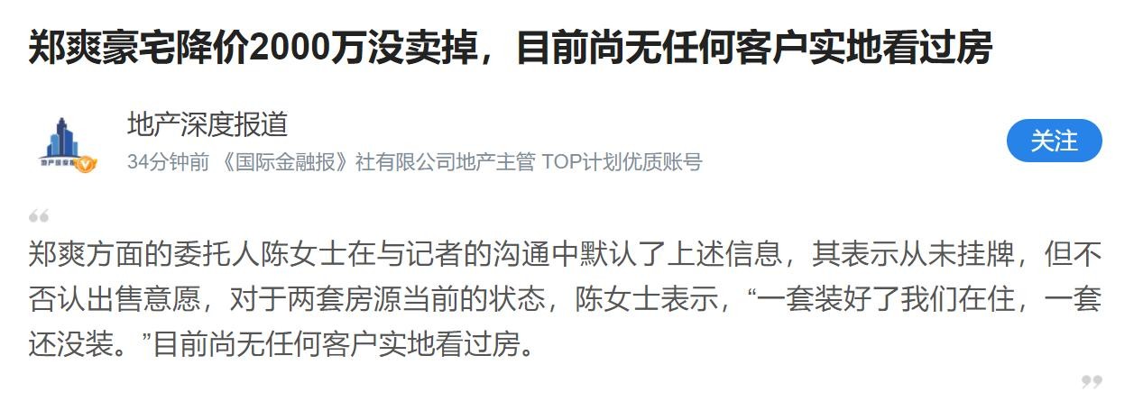 卖房消息挂出来没多久,就传出已经成交的消息。然而1月29日晚,有某地产媒体发出相关报道,从中会发现,郑爽想要出售豪宅是真的,但已经卖掉是假的。
