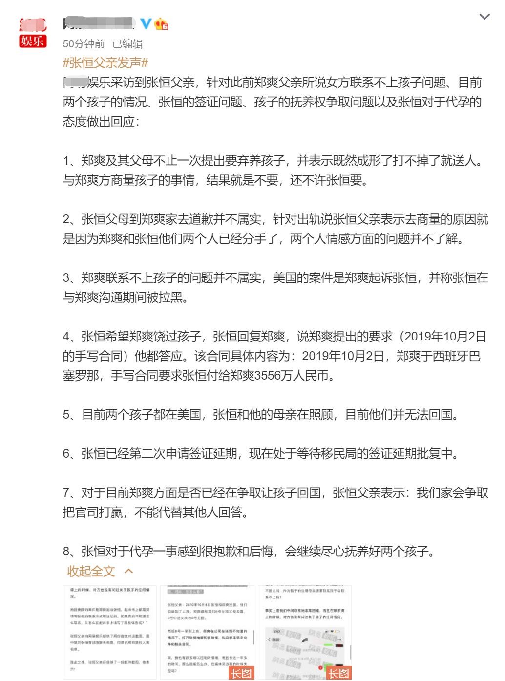 之后张恒父亲也出来发声,指责郑爽及其父母不止一次提出要弃养孩子,郑爽还提出15点要求,让张恒支付给她3556万元人民币。