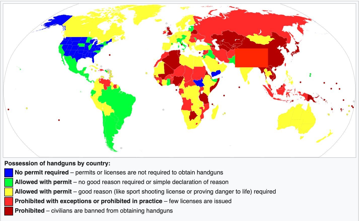 上面这个图,是世界手枪管制地图,蓝色是“不需要执照”,绿色是“颁证不严”,黄色是“颁证较严”, 红色是“几乎严禁”,深红色是“绝对严禁”。