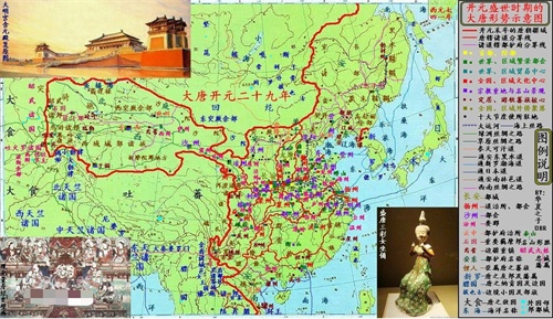经济上大力发展农业,唐玄宗时期全国耕地面积6.6亿亩,兴修大型水利工程38处,生产发展,经济繁荣。军事上,由府兵制改行募兵制,提高军队战斗力,扩张疆域,在开元盛世鼎盛时时期,国土面积达1076万平方公里,南至罗伏州(今越南河静)、北括玄阙州(今俄罗斯安加拉河流域)、西及安息州(今乌兹别克斯坦布哈拉)、东临哥勿州(今吉林通化)的辽阔疆域。