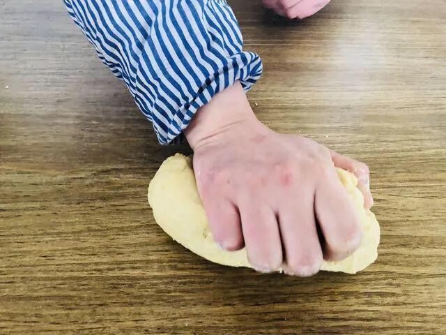 5.用烫好的酥面,加入白糖3.25公斤,青红丝各110克,桂花275克,姜片175克和碱面25克,再放入冷水1 750毫升搅匀,用500克干面搓手,把面搅和到软硬适用为度。在搓条过程中用铺面1000克。