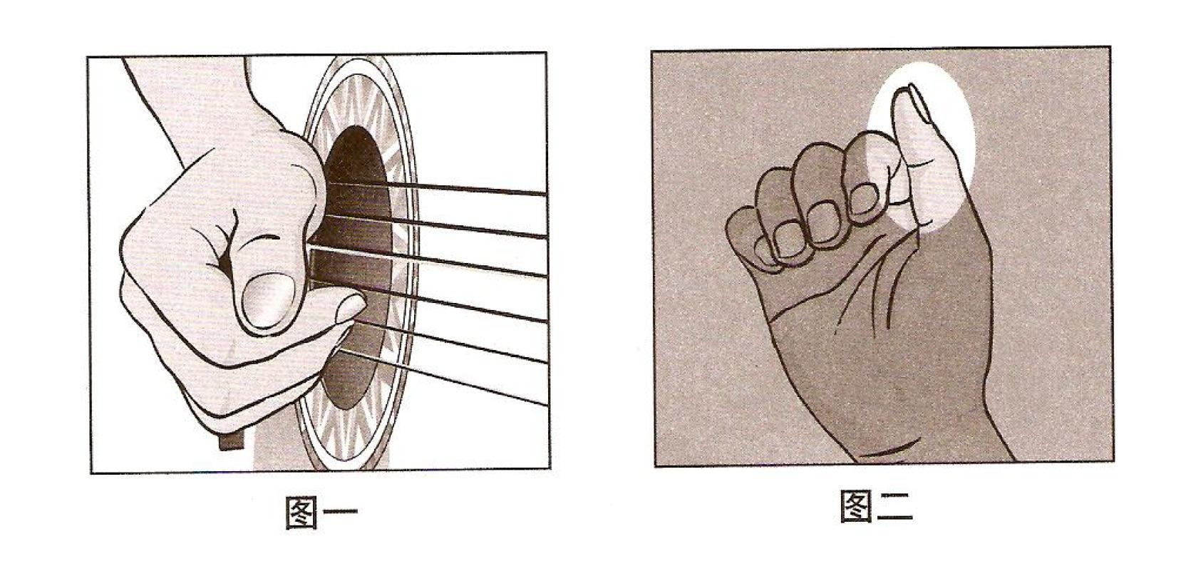 弹奏时。利用右手弹弦后下压的力量,使用手指(国一)与手掌下缘处。将弦击往指板处,除了将此弦制音外,并发出击板的声音。在指板之最末端与音孔交接处,可以得到比较大声的打板声响。另外一种方法是使用拇指侧面〈(图二),借由手腕轻轻旋转,用大拇指的侧边将弦击向指板,然后利用其他手指将弦消音。正因为如此,所以在演奏时,节奏必须鲜明而有力量,节奏动线也必须非常清楚。打板在歌曲中,一般都是以伴奏为主,有时也会搭配另一把吉他来做插音或是即兴的 Solo。