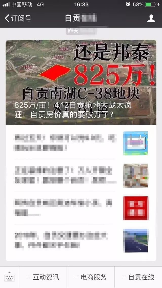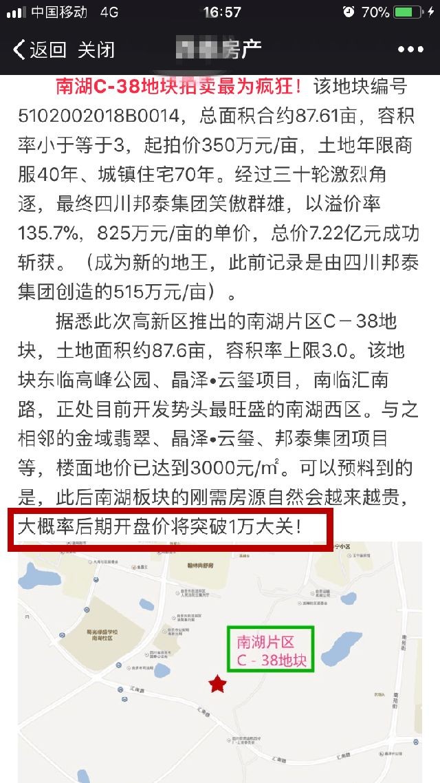“惊!825万/亩天价卫冕自贡新地王,房价破万……”、“4.12自贡抢地大战太疯狂!自贡房价真的要破万了?”、“大概率后期开盘价将突破万 元大关”……从12日下午开始,类似这样标题的文章在自贡的微信朋友圈和部分网站上疯传,其事件的起端便是当天某房地产企业以825万元每亩的价格 在拍得了南湖片区的一块建设用地,成为了自贡新的“地王”。