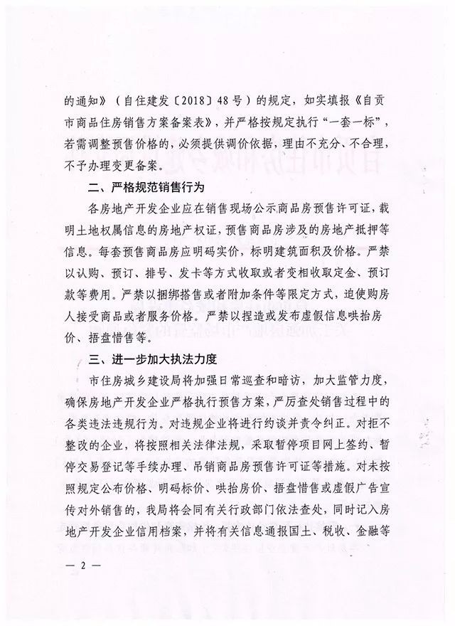据悉,该局将严格执行预售价格申报、价格审查和价格变更备案规定,各房地产开发企业应按照《关于加强新建商品住房销售监管的通知》(自住 建发〔2018〕48号)的规定,如实填报《自贡市商品住房销售方案备案表》,并严格按规定执行“一套一标”,若需调整预售价格的,必须提供调价依 据,理由不充分、不合理,不予办理变更备案。