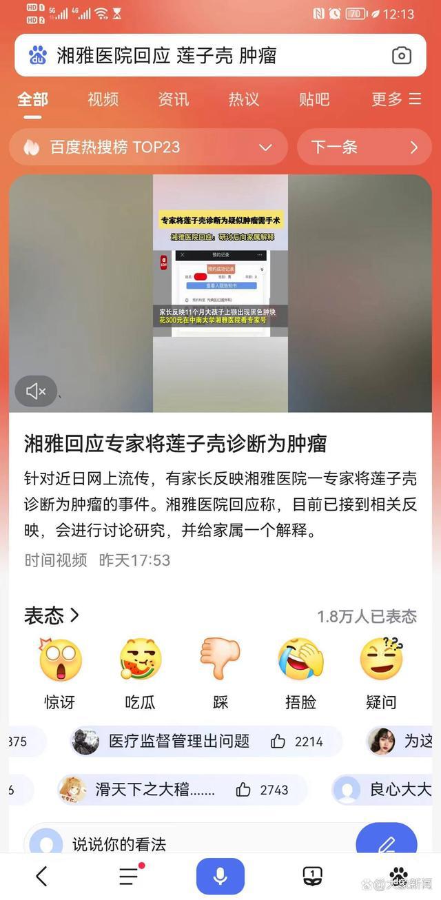 9 月 8 日,# 湘雅医院回应专家将莲子壳诊断为肿瘤 # 的话题登上热搜。