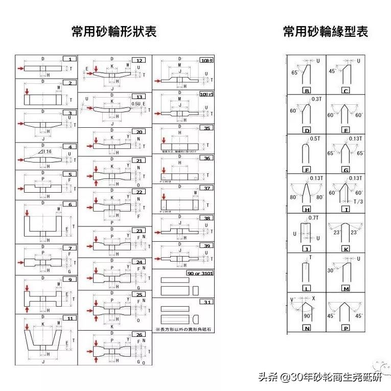 形状:通常以数字编号表示,依照加工的需求、法兰的形状或是磨床的需要,砂轮的形状可能不是普通的圆盘状。所以在购买前,应该要知道自己的砂轮是什么样的形状,并提供所需的尺寸资讯。缘形:指研磨面形状,通常以字母编号来表示。依照加工需求,砂轮的研磨面形状也有所不同。在购买砂轮前也应确认。普通默认为基础A形。也可用A形另外再修整为自己要的缘形。尺寸:日文称“寸法”,单位皆为mm。照顺序表示:外径x厚度x内径。若是砂轮是其他的形状,需要标示其他细节尺寸,也会标示在后面。