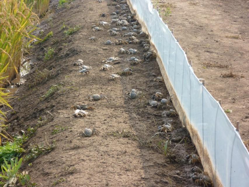 在稻田的入水口和出水口设置铁丝网,在稻田的田埂上,四周都要装上光滑的塑料板或者铁板,高度在40厘米左右。