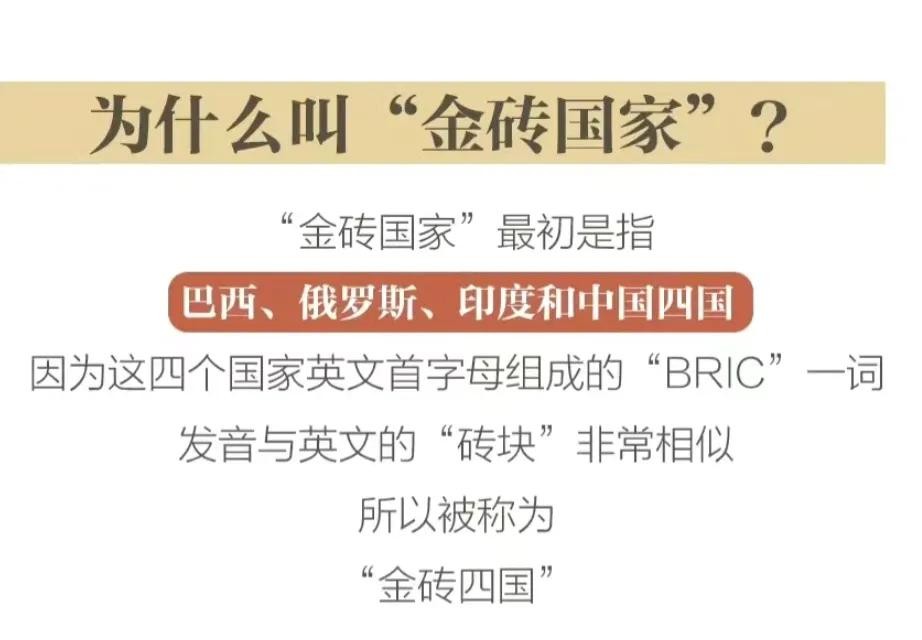由于“BRIC”的发音与英文单词“砖块”(bricks)相近,这四个国家便被形象地称为“金砖国家”。这一比喻不仅容易记忆,更寓意着这些国家作为新兴经济体的崛起和潜力。