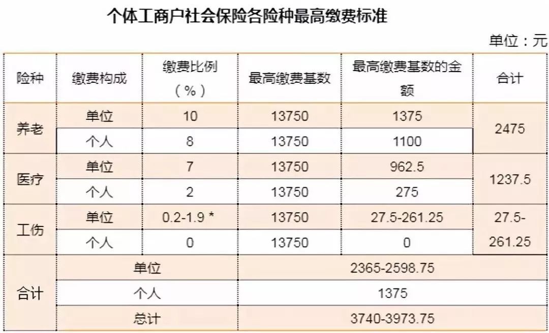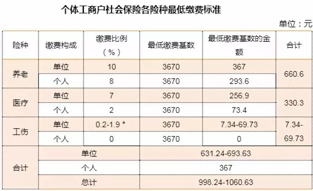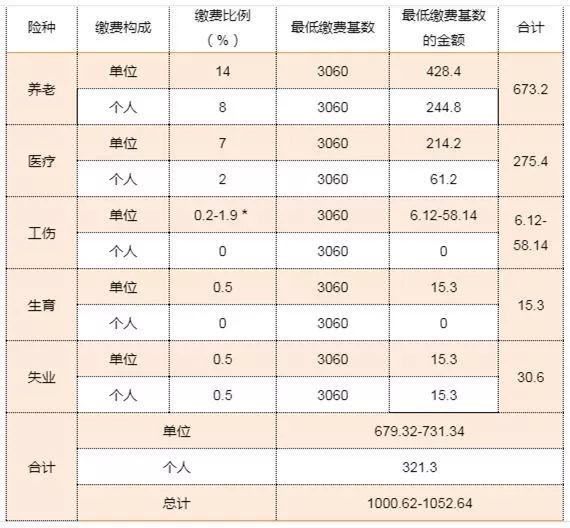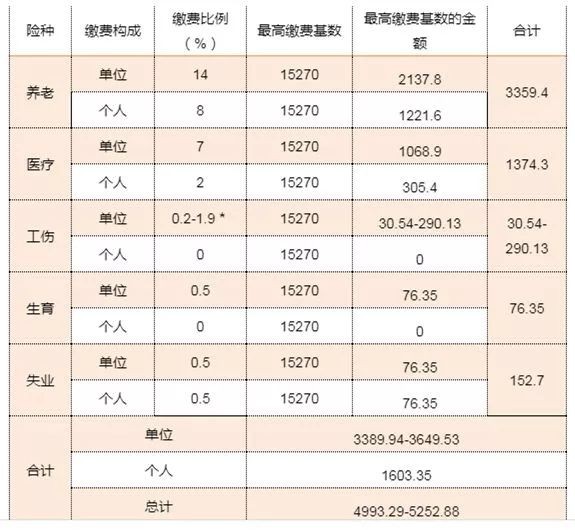 *工伤保险费率:不同工伤风险类别的行业执行不同的工伤保险行业基准费率。一类至八类的行业基准费率分别为0.2%、0.4%、0.7%、0.9%、1.1%、1.3%、1.6%、1.9%,每年按用人单位费用使用情况、工伤发生率等因素浮动,个人不缴费。表中仅选其中一个费率作为例子。