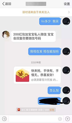 于是白先生便在微博中私信她,对方回复“200红包加宝宝私人微信,宝宝会回复你要微信号码。”在转账200元并成功添加微信后,白先生给她发信息、视频聊天都没有回应,对方朋友圈中也没有任何活动迹象。后来白先生得知除他自己之外还有多人被骗,而且评论区的用户都是“托儿”。他反思道:“我就是一时‘冲动’,大家千万引以为戒”。
