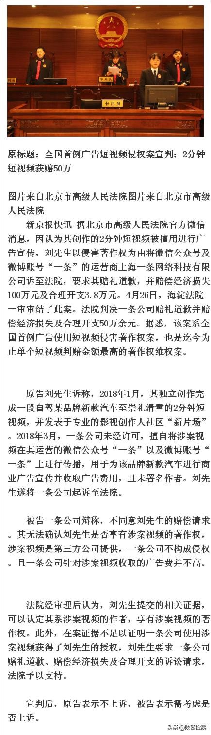 全国首例广告短视频侵权案:2分钟视频获赔50万