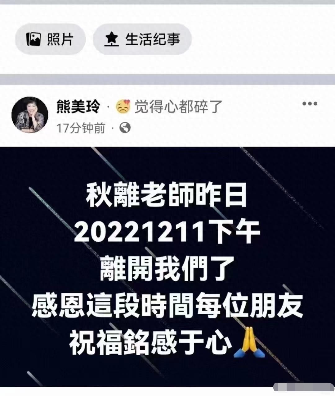 熊美玲发布动态表示,觉得心都碎了,想必一定很难过。她在文中写道:“秋离老师昨日(2022年12月11日)下午离开我们了,感恩这段时间每位朋友,祝福铭感于心”。