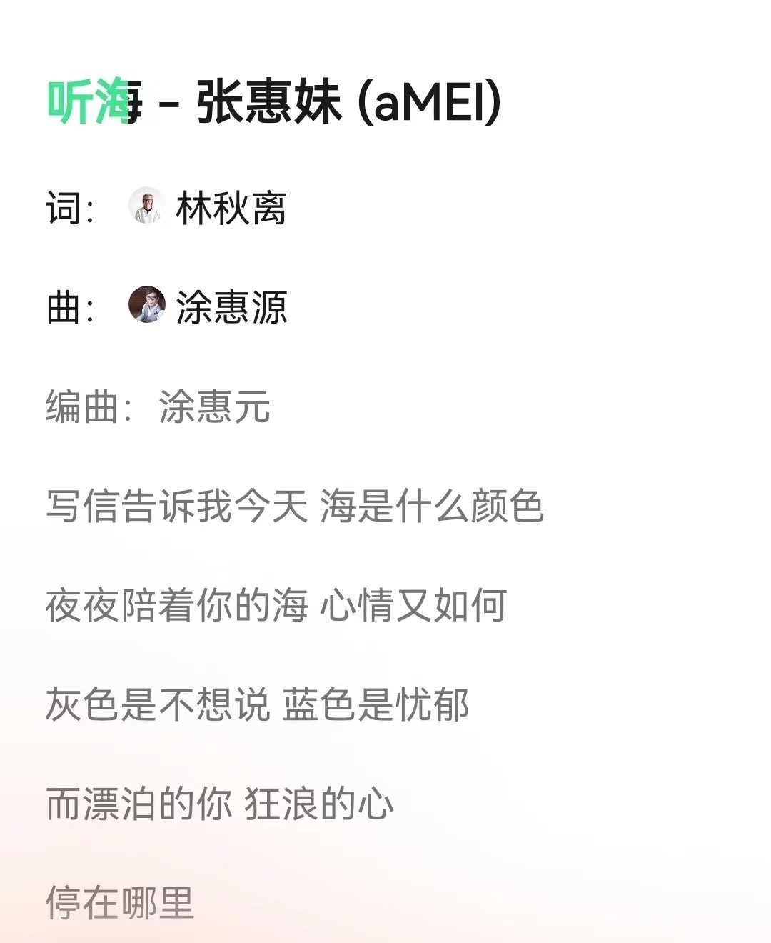 林秋离谱写过众多经典佳作,对台湾香港的艺人都帮助颇多。他曾为张惠妹《听海》作词,“听海哭的声音”一直流传至今,被众多歌手翻唱,这首歌当年传唱度非常高。