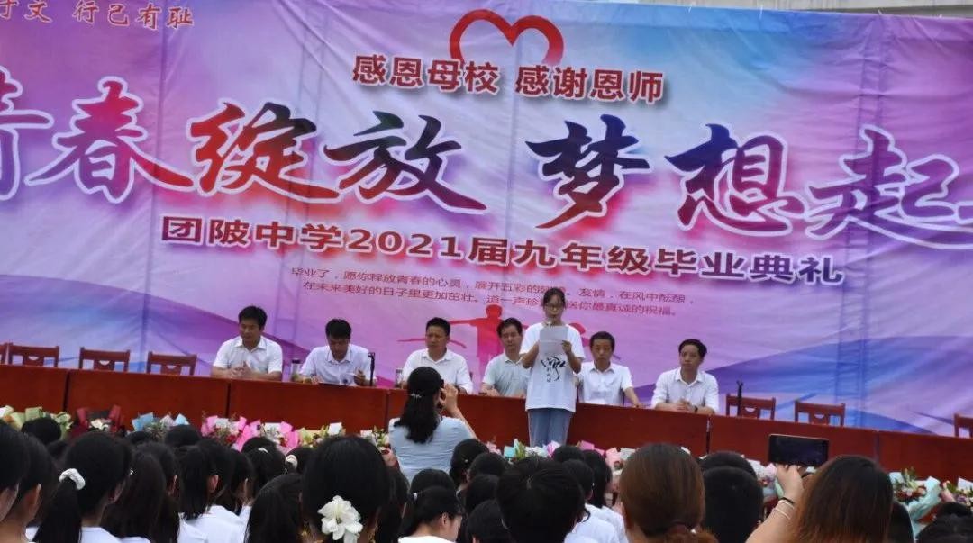 6月12日上午8:00,浠水团陂中学“青春绽放、梦想起航”2021届初三年级毕业典礼在操场举行。学校领导、初三年级全体教师、部分家长代表出席典礼。