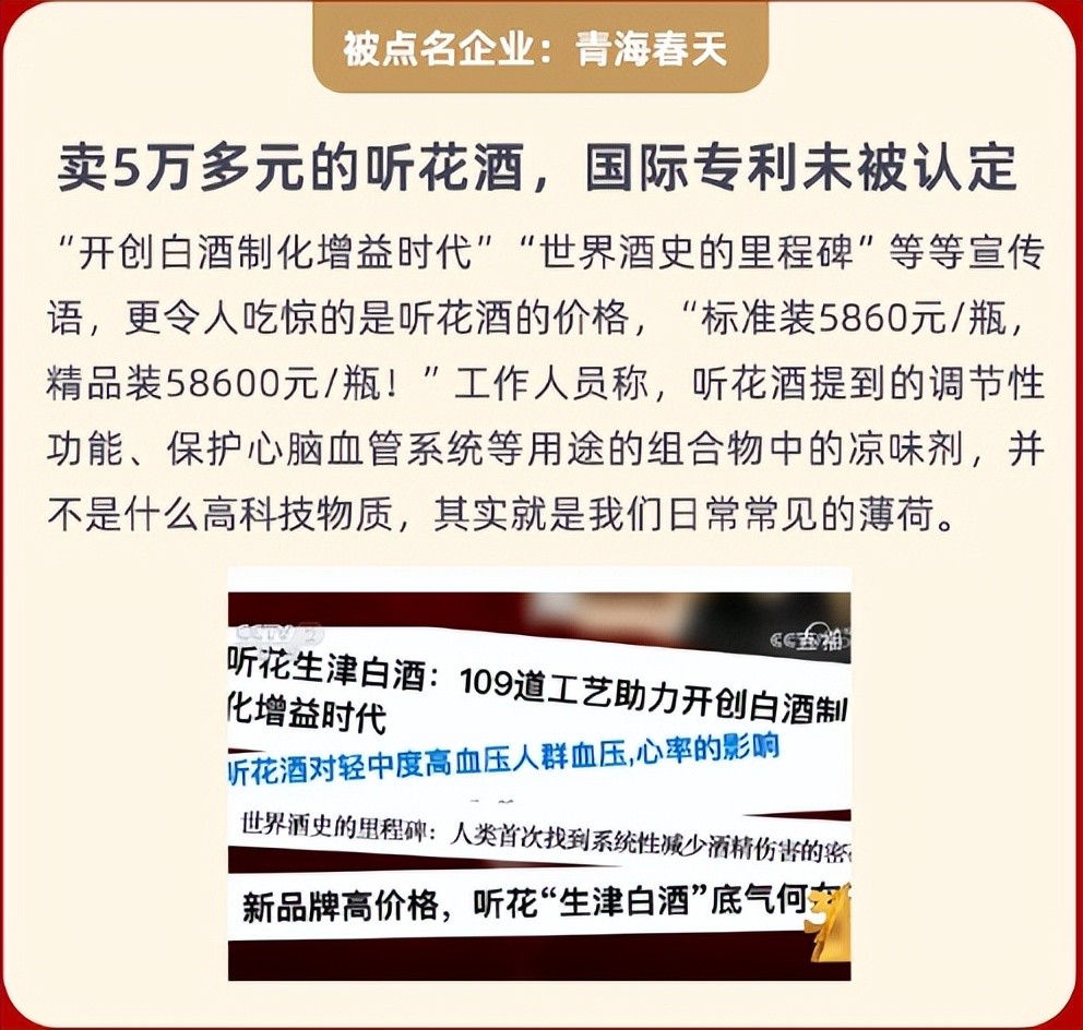 另一方面,央视315晚会还关注了一些涉及消费陷阱的问题。宜宾天花酒业发展有限责任公司销售的高价听花酒被揭露真伪难辨,消费者陷入了价格虚高的陷阱中。