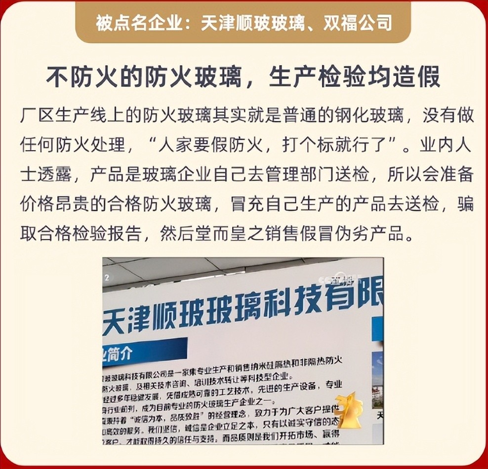 其次,晚会揭露了一系列生产防火玻璃的企业存在的造假行为。天津顺波玻璃公司、廊坊永斌玻璃科技有限公司等公司被曝光涉嫌制造假冒产品,给消费者的生命财产安全带来了极大的隐患。