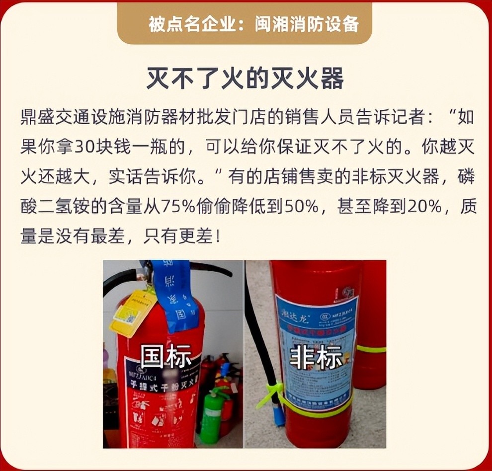 另外,央视315晚会还揭露了一些销售劣质火器的企业。湖南万江消防设备有限责任公司、湖南株洲闽乡消防设备有限公司等公司销售的非标准灭火器,存在严重的安全隐患,给社会带来了不小的安全隐患。
