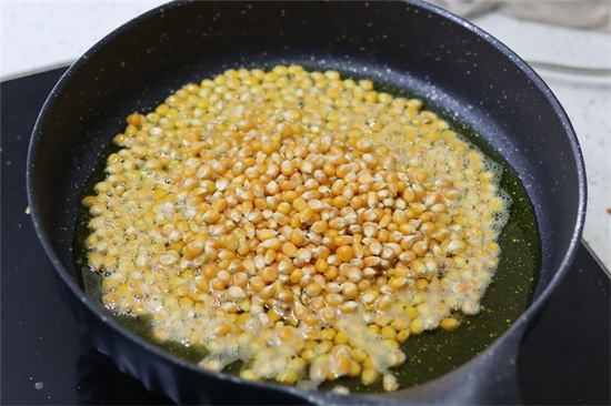 3、盖上锅盖,开中小火慢慢加热,锅中的玉米会持续不断的爆裂。