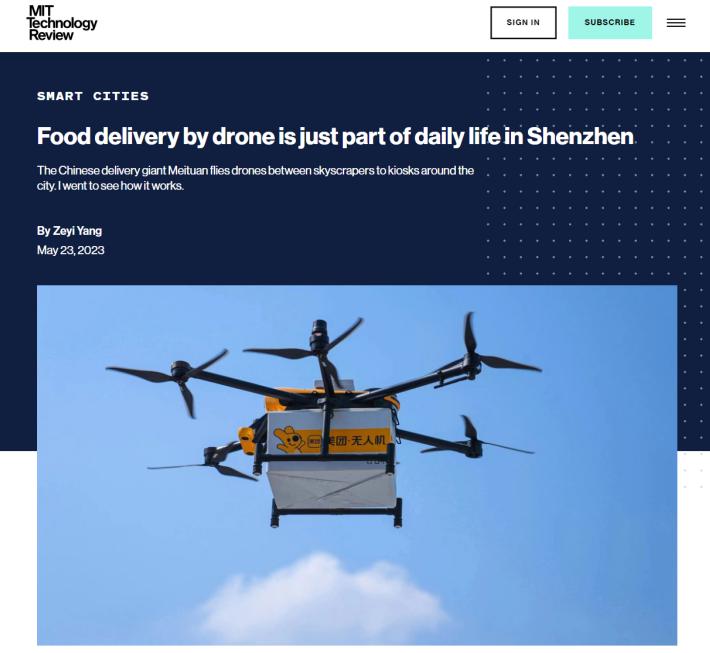 北京时间 5 月 23 日,国际权威科学杂志《麻省理工科技评论》在官网发表了《无人机配送已成深圳城市生活一部分》一文。文章称,尽管美国公司早在 2013 年就在探索无人机配送,但中国公司美团目前已基于中国城市特点,探索出一条与国内外同行截然不同的发展路径:他们无人机配送服务落地的首站,选择在可能是最具挑战性的环境——深圳城市人口密集区。其进展则表明,在城市中进行有计划的无人机配送是可行的,无人机配送服务已成为深圳城市生活的一部分。