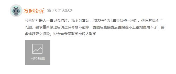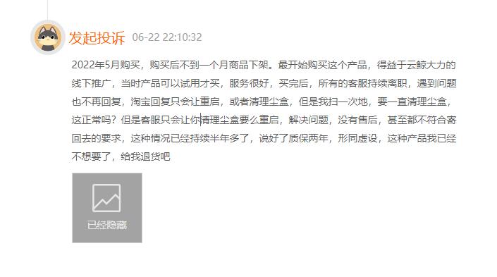 还有消费者反映云鲸售后得不到保障," 说好了质保两年,形同虚设 "" 客服只会让你清理尘盒要么重启 "。