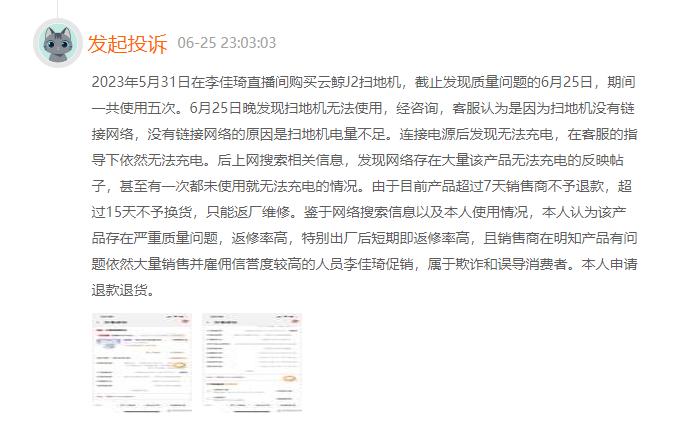 有消费者称,云鲸扫地机器人问题频出," 连接电源后发现无法充电 "" 出厂后短期即返修率高 "。