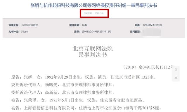 3月6日,北京法院公布张天爱名誉权案胜诉的判决书。