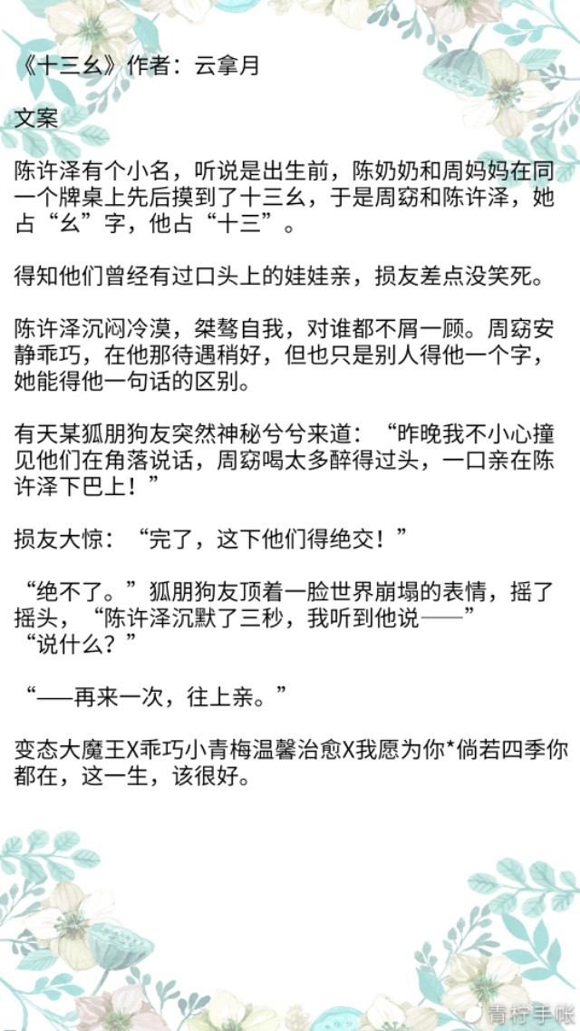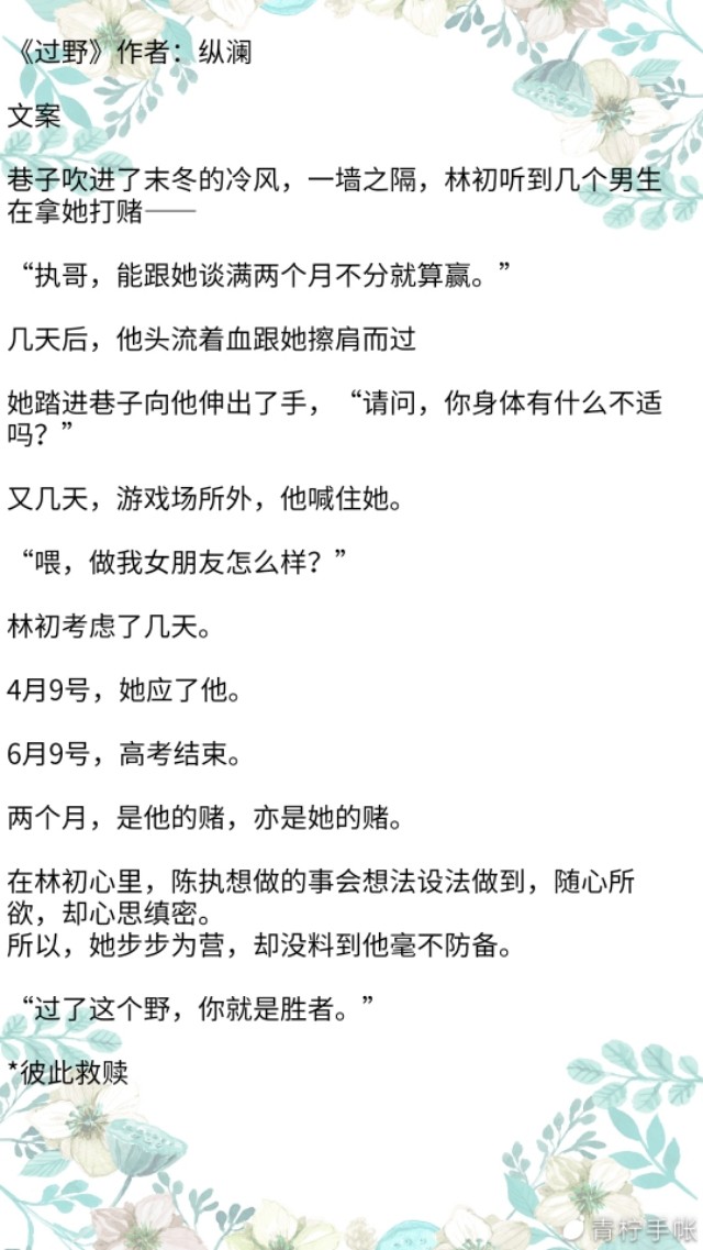简评:女主因为一个目的接近男主,而男主也因为自己家庭原因想要放弃。总之,这篇文他们两个人是互相救赎的,两个人的性格都有缺陷,但是作者大大的文笔很好哦。