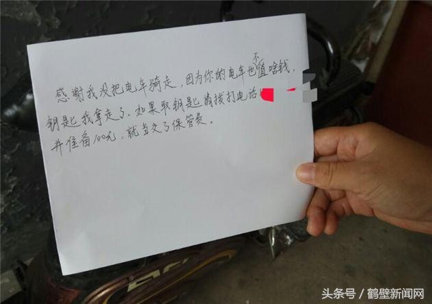 9月2日,山城区李先生致电百姓热线称,因为一时疏忽忘记拔掉电动车的车钥匙,等他回来骑车时电动车还在,可钥匙没了,车座上还贴了一张令哭他笑不得的纸条。