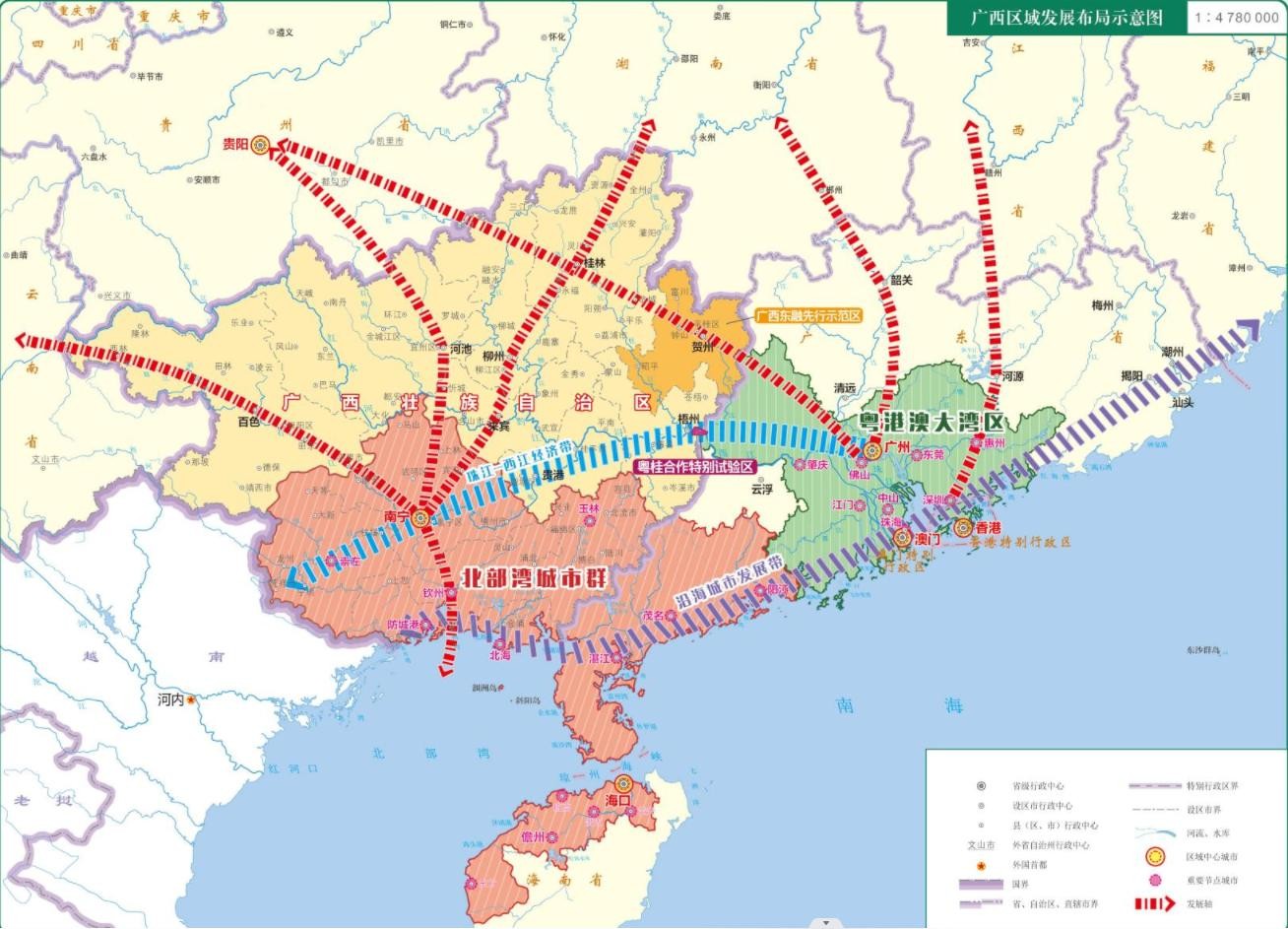 广西东临中国第一经济大省广东,今年提出全力东融战略,共建珠江-西江经济带、东融先行示范区(贺州)、粤桂特别合作区(梧州),与广东、海南共同打造北部湾城市群