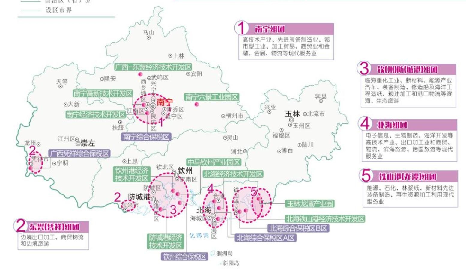 广西还有北部湾经济区,主要是以南宁为核心,沿海北钦防三市为前沿,玉林、崇左为两翼的格局,占广西三分之一面积,五分之二人口,二分之一经济总量,83%外贸。