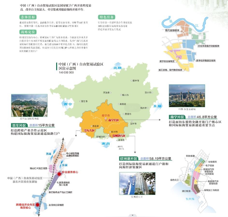 中国(广西)自由贸易试验区有南宁片区46.8平方公里,崇左片区15平方公里,钦州港片区58.19平方公里