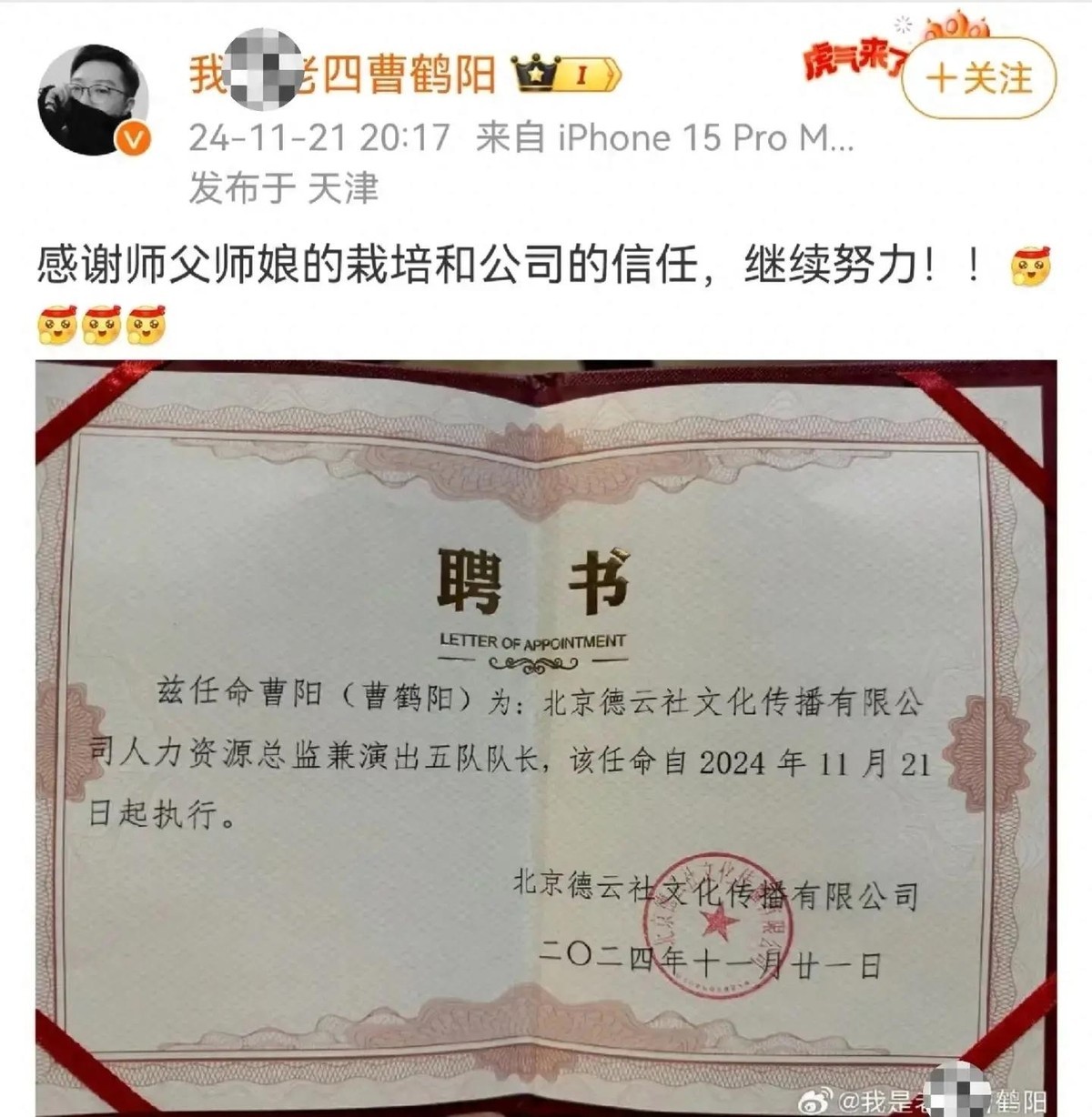 2024年初,德云社总部决定对管理层进行调整。烧饼凭借着多年来在业务和管理上的出色表现,被任命为副总。而曹鹤阳则凭借其敏锐的眼光和丰富的舞台经验,担任了五队队长和人力资源总监的双重职务。